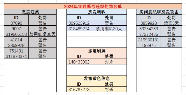 中游运营团队将定期对游戏内账号进行排查,对部分账号存在的违规行为,将进行严格处理;对多次违规的账号会不断加大惩罚力度(最高永久封禁)。