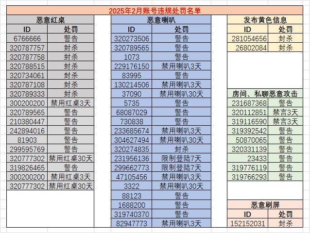 中游运营团队将定期对游戏内账号进行排查,对部分账号存在的违规行为,将进行严格处理;对多次违规的账号会不断加大惩罚力度(最高永久封禁)。