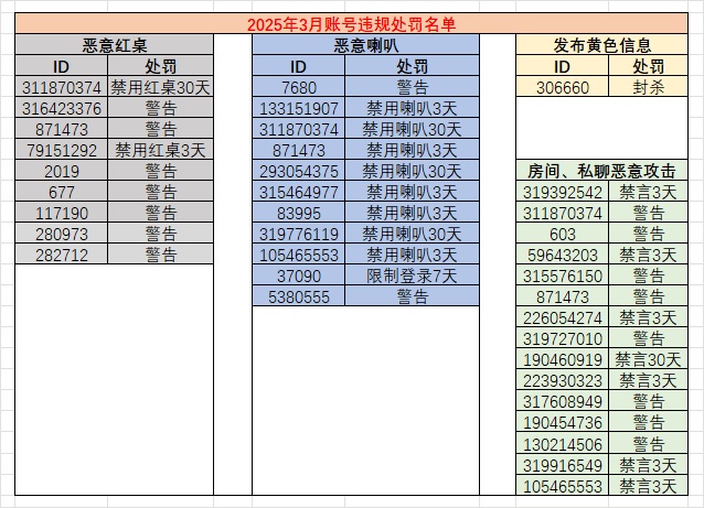 中游运营团队将定期对游戏内账号进行排查,对部分账号存在的违规行为,将进行严格处理;对多次违规的账号会不断加大惩罚力度(最高永久封禁)。