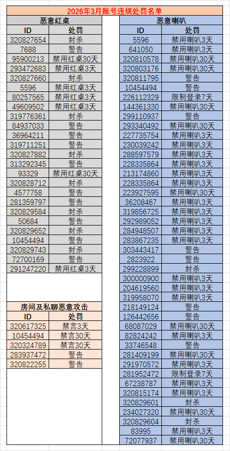 中游运营团队会竭尽全力保证每一位玩家的游戏利益,希望广大玩家共同努力,遵守游戏规则,共同打造公平、有爱的游戏平台。中游运营团队将定期对游戏内账号进行排查,对部分账号存在的违规行为,将进行严格处理;对多次违规的账号会不断加大惩罚力度(最高永久封禁)。