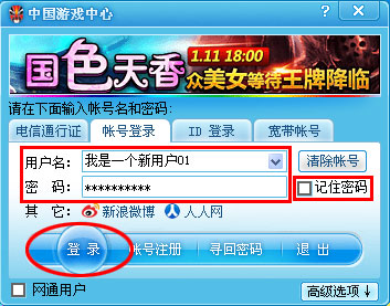 这时,会出现游戏大厅的登录窗口,分别填上您刚才注册的用户名和密码,然后点击“