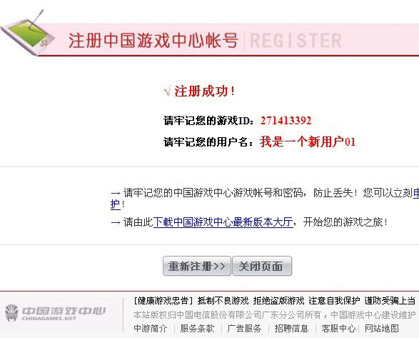 这时将会出现提示您注册成功的界面,并有相关的提示信息提醒您注意: